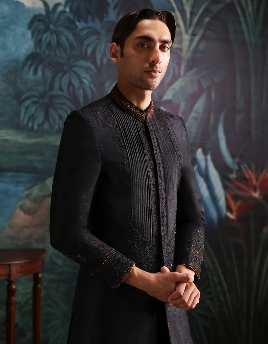 Blue self-black jamawar texture sherwani based on heavy embroidery all over using a unique element of cut & sew which highlights its presence from others.
